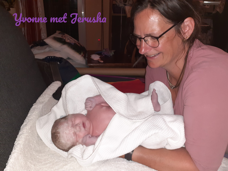 Om 8 uur hoorde ik het belletje van de voordeur, waardoor ik wist dat Yvonne binnen was. Ze wenkte naar Geertjan, mijn man, dat zij direct naar de woonkamer ging om spullen klaar te zetten. Na 10 minuten wilde ik uit bad, ik wilde op de bank gaan liggen, voelde me zo moe. We wachtten nog een wee af en toen liepen we naar de woonkamer. Maar daar bij de deur kwam er zo’n sterke wee, dat ik dacht: ze komt! Ik reikte Yvonne de hand, die in de woonkamer nog de spullen aan het klaar zetten was, en wees gelijk naar de baarkruk. We liepen daarheen, ik zakte op de kruk, nog één wee, en daar was ze! Geertjan had geen tijd gekregen om achter me te gaan zitten. Hij stond naast me. Ik had z’n hand vast en was scheef op de kruk gezakt. Ik had geen krachten meer om recht te gaan zitten. Deze houding zorgde voor een zeer voorspoedige uitdrijving, zonder inscheuren, maar ook voor een verrekte spier in m’n nek, waar ik nog dagen last van heb gehad. Ach, dat was maar een bijzaak. Ze wás er! En zeer voorspoedig! Yvonne was 15 minuten binnen, had nog geen controle gedaan of iets, maar mocht gelijk ons meisje opvangen. Wat was dat een heerlijk moment op de bank. We moeste nog een uur op de placenta wachten, maar dat deerde niet. We hadden alle tijd. Yvonne vroeg nog om een bolletje wol om een mooi draadje te vlechten om de navelstreng af te binden. En zo stonden Geertjan en Yvonne samen een draadje te vlechten terwijl Jerusha aan de borst lag...